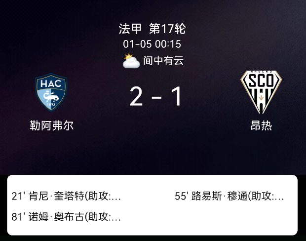 法甲第17轮阿若克建功肖塔尔锁定胜局布雷斯特20欧塞尔