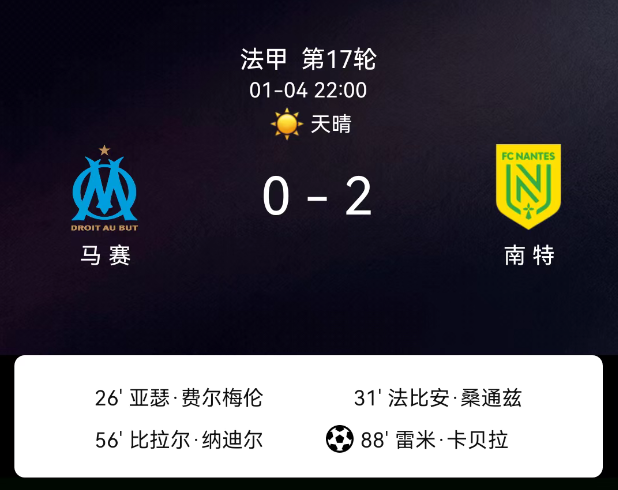 法甲第17轮马赛两人染红9人应战南特20马赛客场取胜